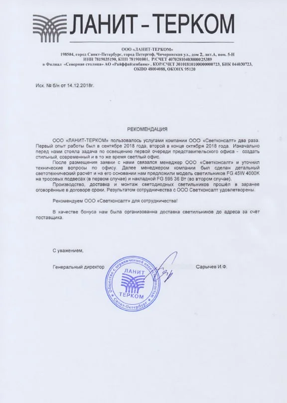 Продажу продукции осуществляет ГК «СветКонсалт» — официальный представитель завода-изготовителя. Наши специалисты оснащают объекты LED светильниками более 10 лет и являются экспертами в своем деле. За годы работы реализованы проекты практически во всех сферах — от медцентров и стадионов до аэропортов и угольных шахт.
